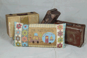 A long cushion featuring a car and caravan, with a sweet verse, English paper-pieced hexagons and simple construction.