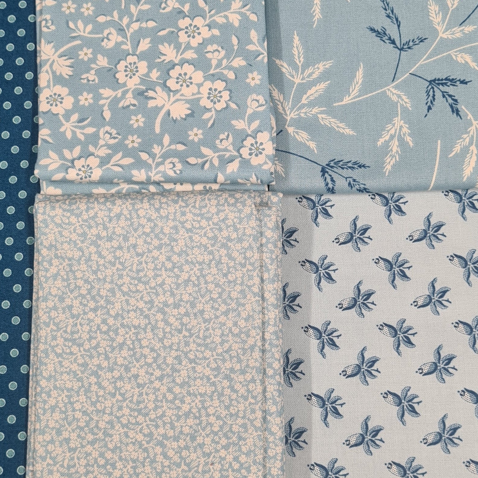 This BOM features stunning blue fabrics from the Liberty range, see the photo of the Liberty fabrics that we've chosen. The binding is Liberty York Fern, at the bottom right of the fabric picture. Note: Quilt image is completed with different fabrics by the designer.