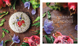 Pomegranate & Cranesbill Pinwheel by Susan O'ConnorEmbroidered pinwheel with red fruits beneath delicate blue flowers and green seed pods