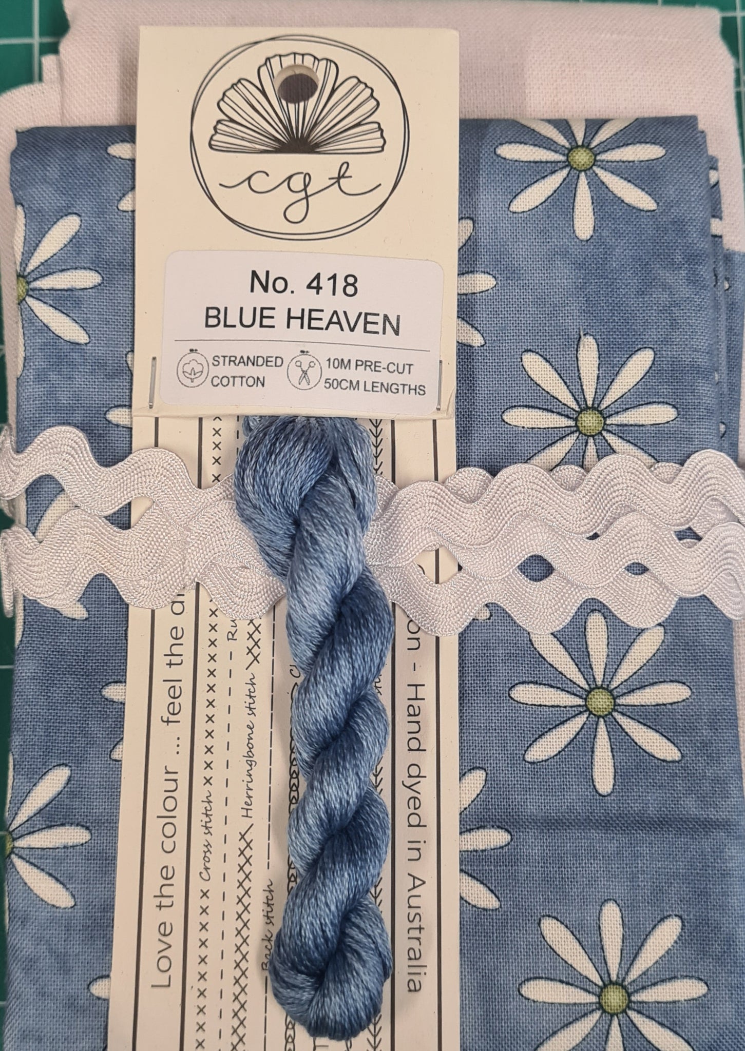 This kit includes the pattern for both versions of the tablerunner and the fabrics, thread & ric rack for the BlUE version.
