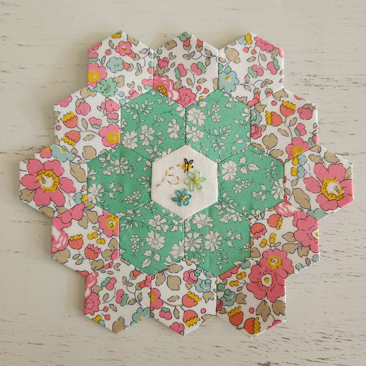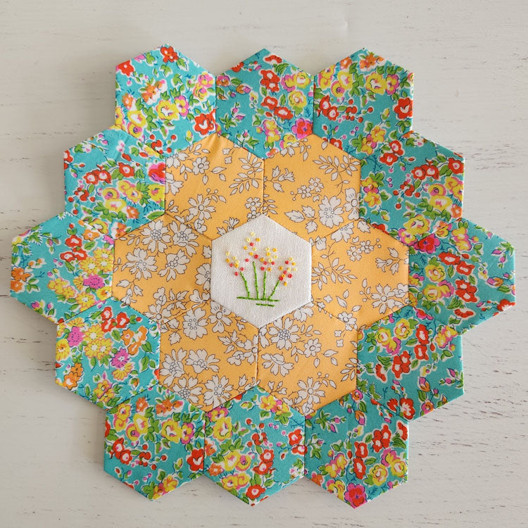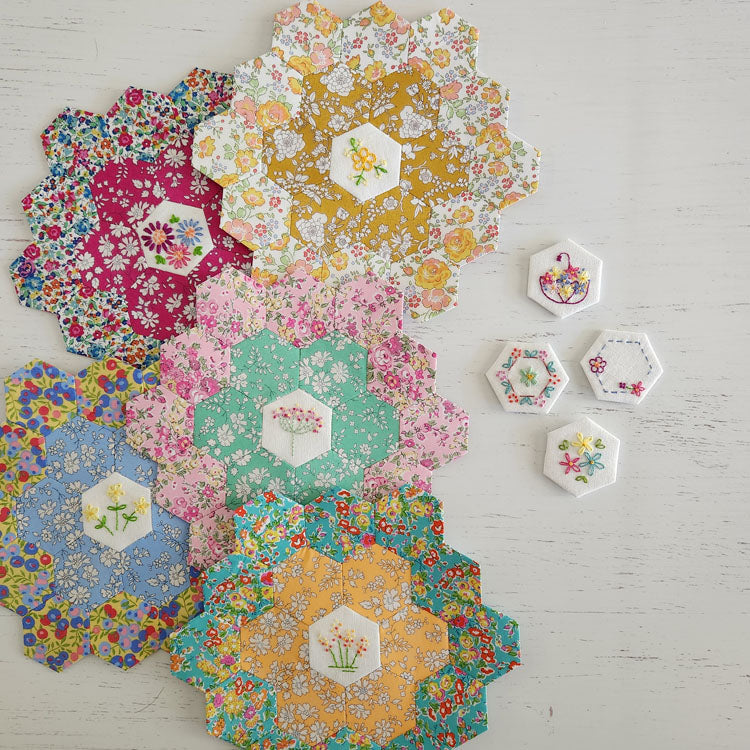 The designs fit a 1” finished Hexagon and have a 3/8” seam allowance ready to be English Paper Pieced.