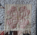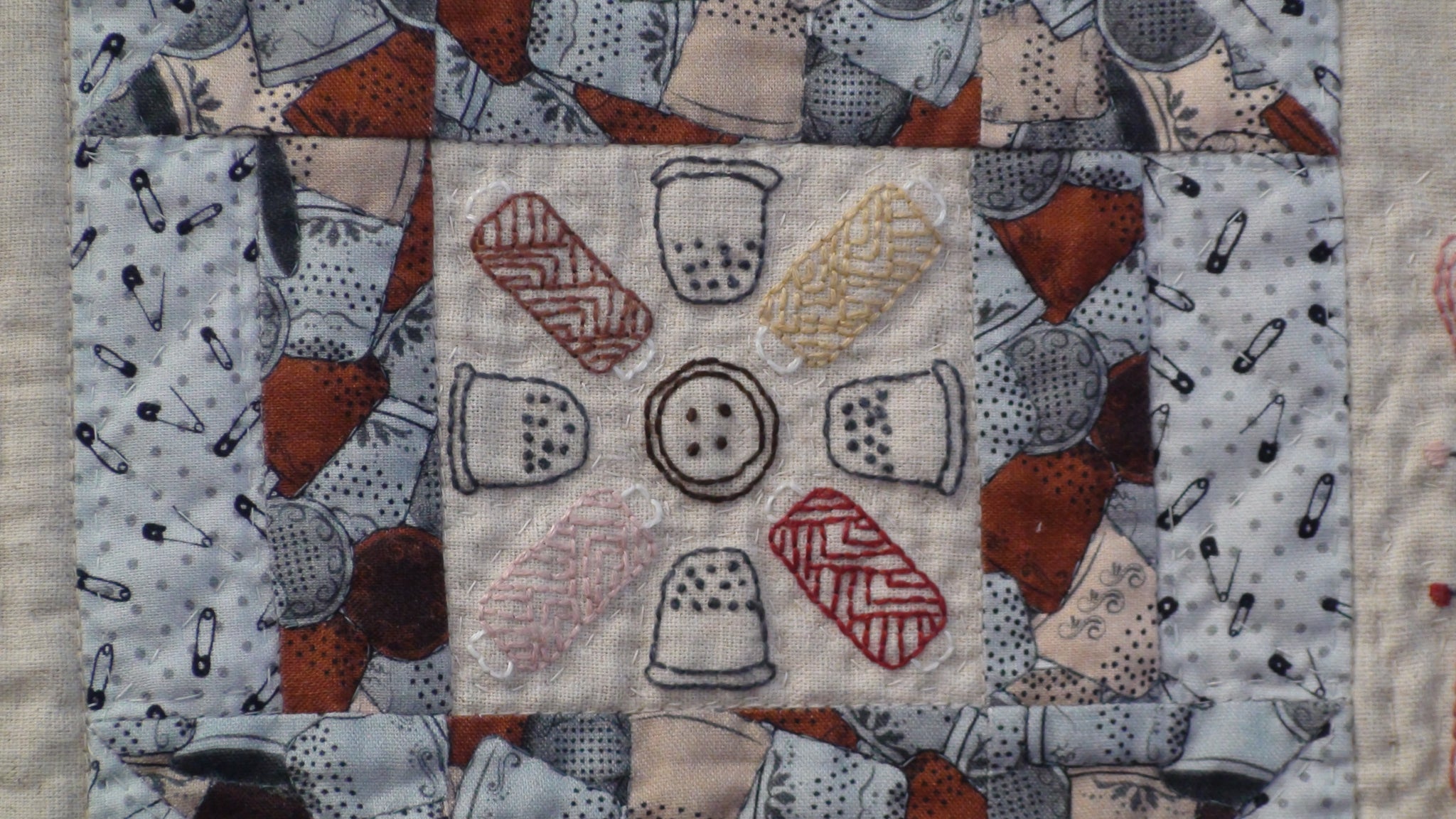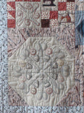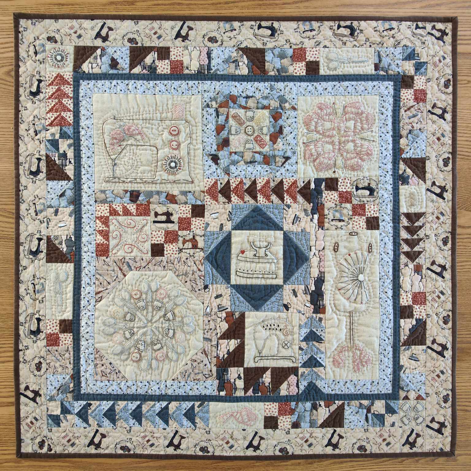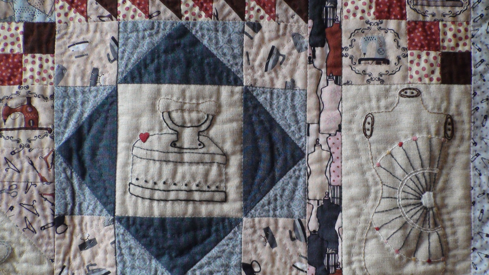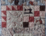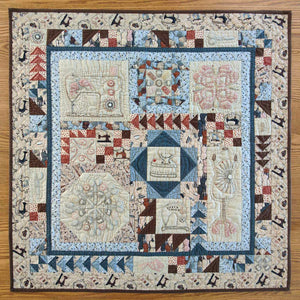 The notions on the fabric used in this quilt inspired the designs of the mandala-like stitcheries. You will use basic stitch techniques to finish this quilt. The stitcheries are set off with easily pieced patchwork blocks.