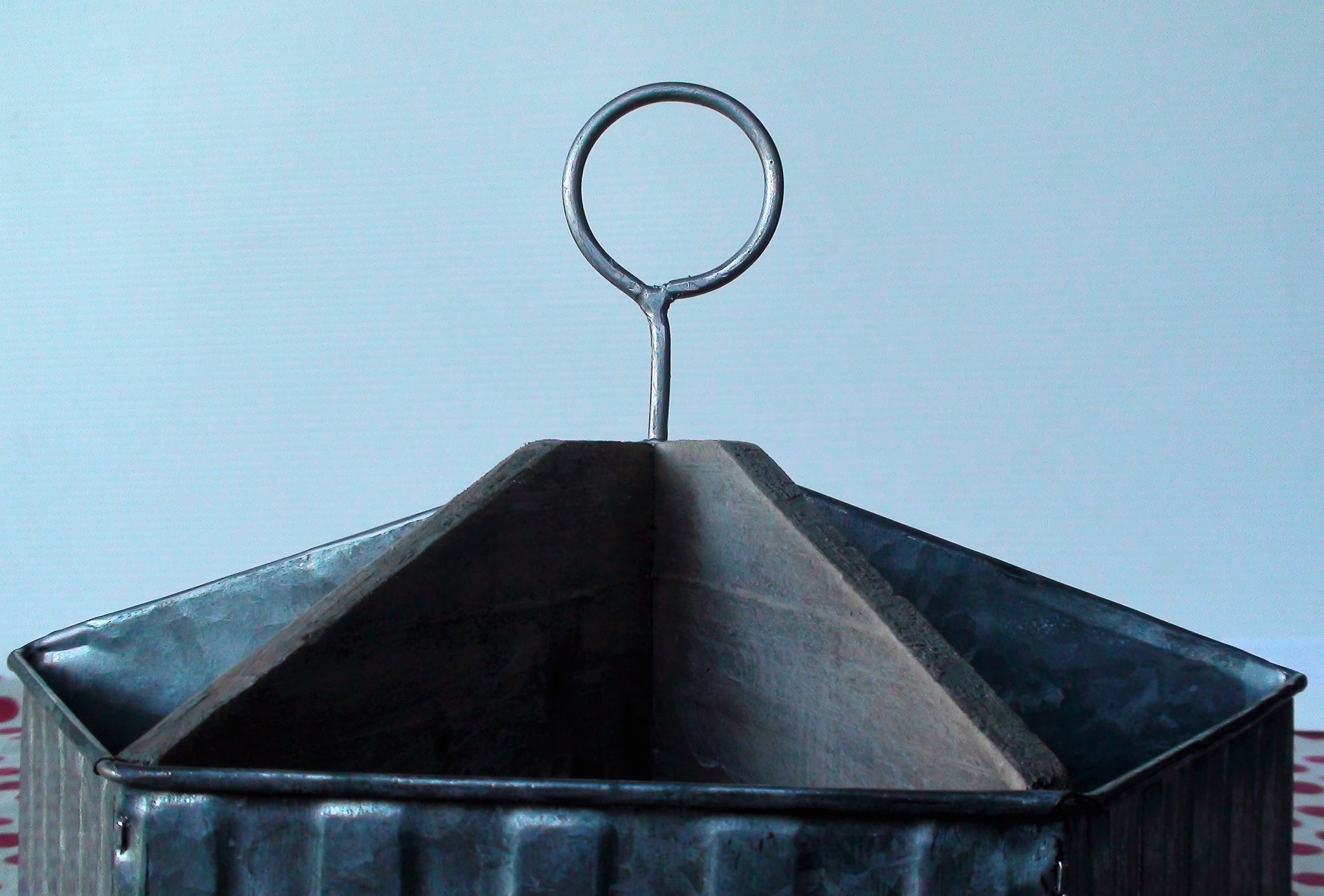 Galvanized metal & wood desktop organiser, ~deep triangular dividers for storing creative supplies & kitchen ware. Has a flat back so sits nicely against the back of a desk/shelf.